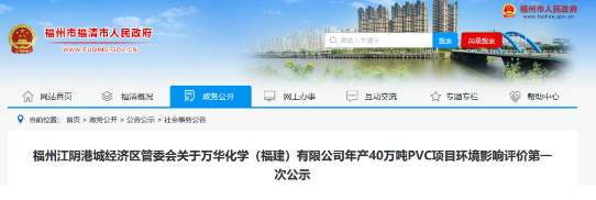 10月10日,福州江陰港城經濟區管委會發布關于萬華化學(福建)有限公司年產40萬噸PVC項目環境影響評價第一次公示。萬華化學(福建)有限公司擬以40萬噸/年MDI及25萬噸/年TDI(擴建)等異氰酸酯裝置為核心,配套建設以煤為原料的氣化裝置區,提供MDI及TDI生產需要的CO氣體、苯胺合成需要的H2氣體;擬建設以甲醇為原料的空氣氧化法生產的甲醛裝置;東南電化氯堿裝置將為MDI/TDI生產提供所需的原料氯氣和燒堿,東南電化以原鹽為原料,以離子膜電解生產液氯及燒堿溶液,同時副產的氫氣作為苯胺的原料綜合利用。