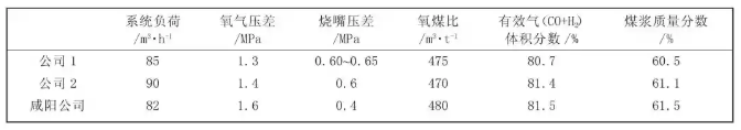 由表1可以看出,3家公司氣化裝置系統負荷、氧煤比、煤漿濃度及有效氣組分差異不大,氧氣壓差和燒嘴壓差數值存在明顯差異。