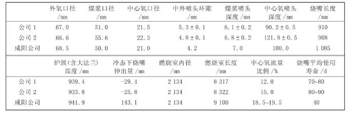 2. 燒嘴長度:咸陽公司燒嘴長度1 085 mm,較公司1與公司2(兩者燒嘴長度基本相同)長約175 mm。